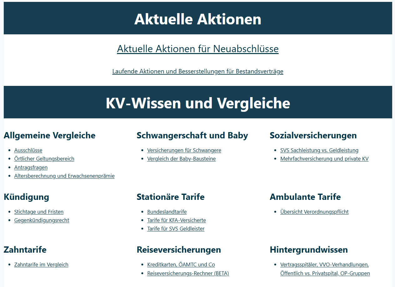 In unserer umfangreichen Wissensdatenbank findest du umfangreiche Analysen zu den Versicherern. Wer verlangt für welche ambulanten Leistungen vorab eine Verordnung? Wo gibt es gerade KV-Aktionen? Wo kannst du eine bereits Schwangere versichern? Alle Antworten auf einen Blick – umfassend recherchiert.
